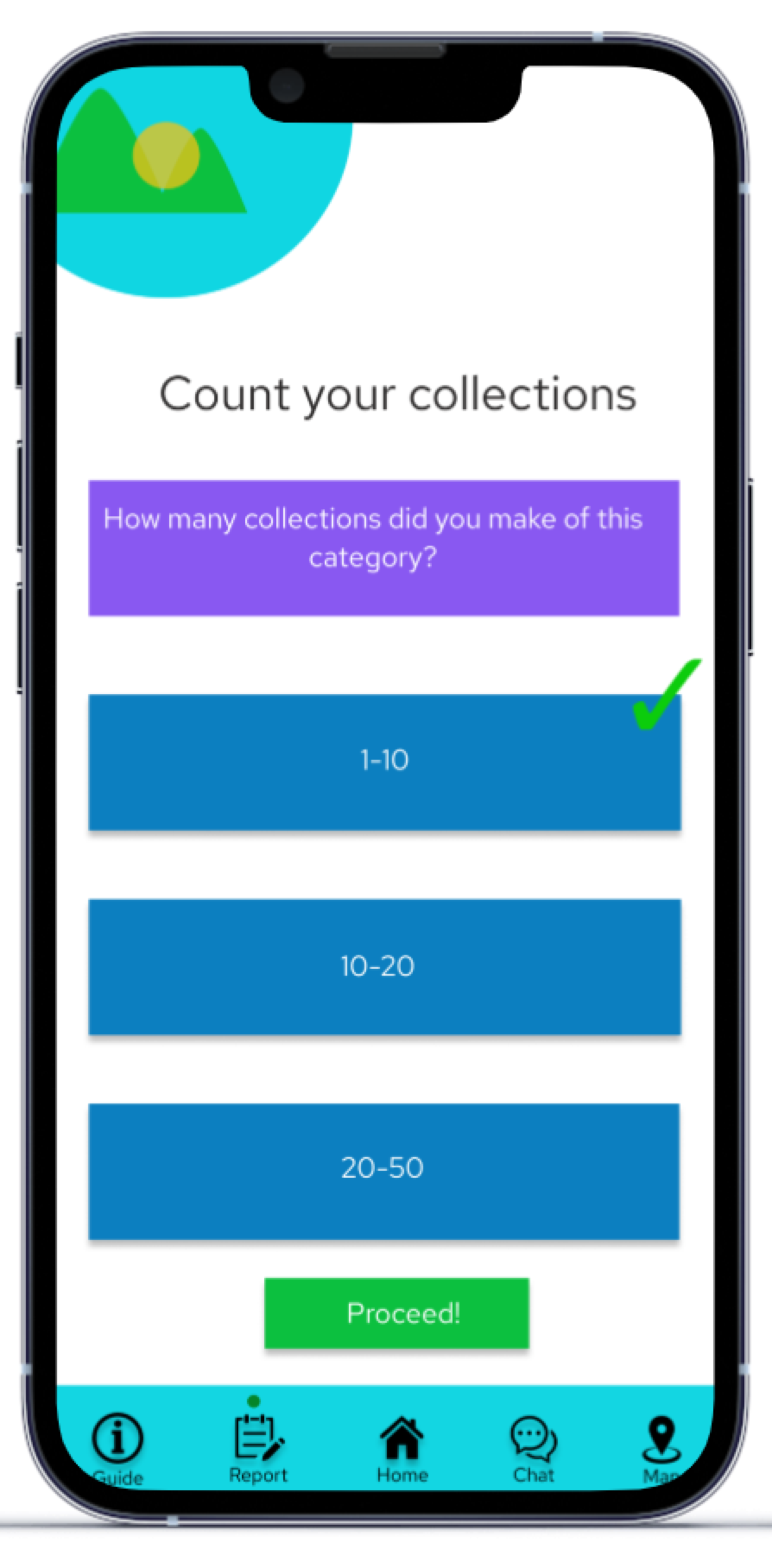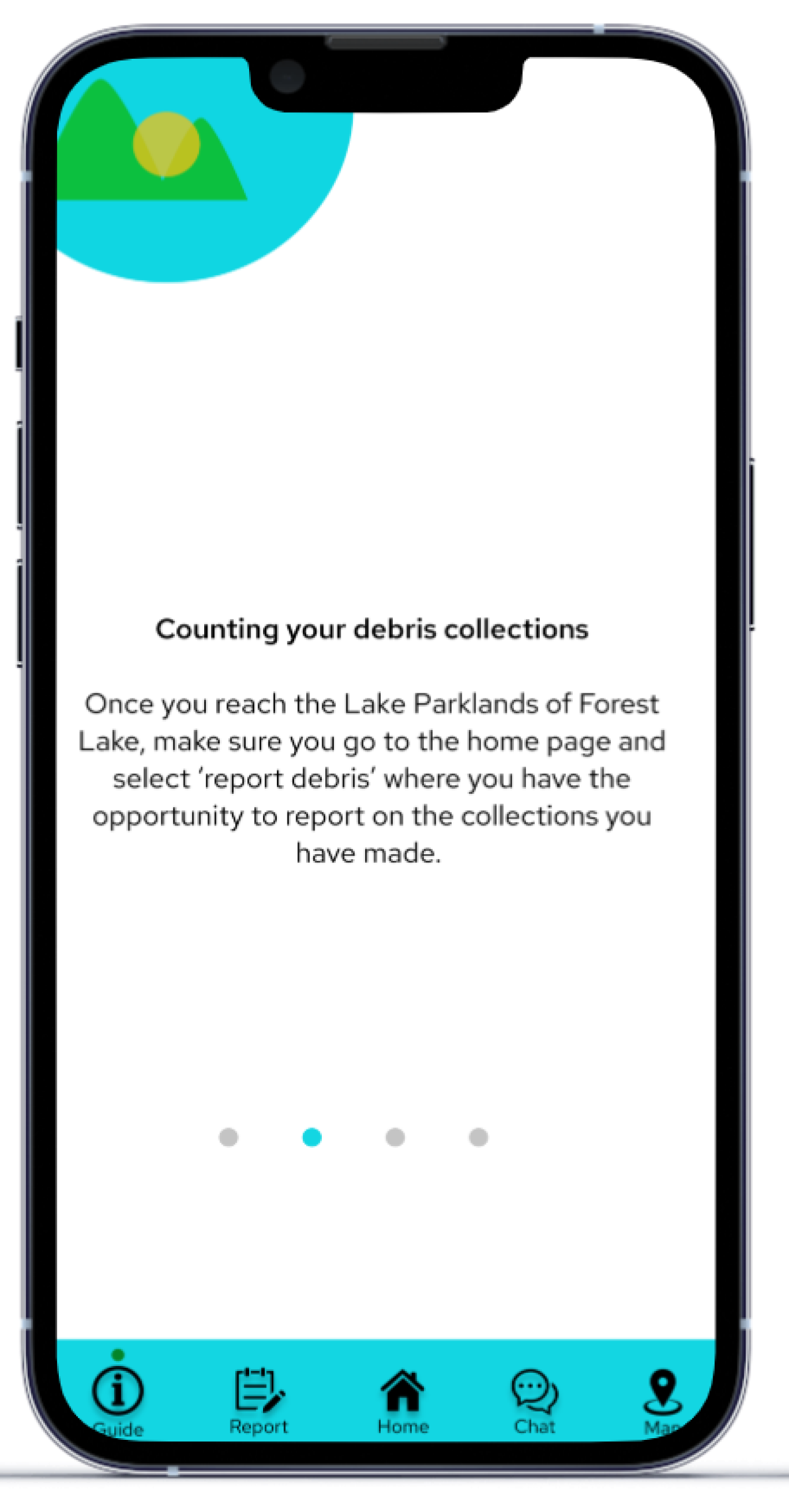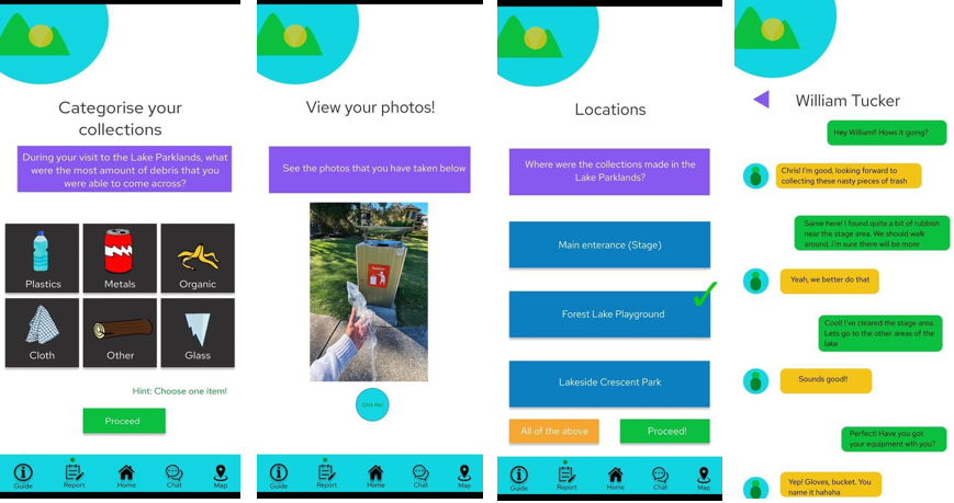 The "Report Debris" feature enables users to document their collections as they explore the Lake Parklands of Forest Lake. To maintain user engagement during the collection process, the app incorporates captivating colours and imagery. Users are prompted to specify the type of collection they made, such as plastics or metals, and accurately record the quantity to ensure precise data collection.