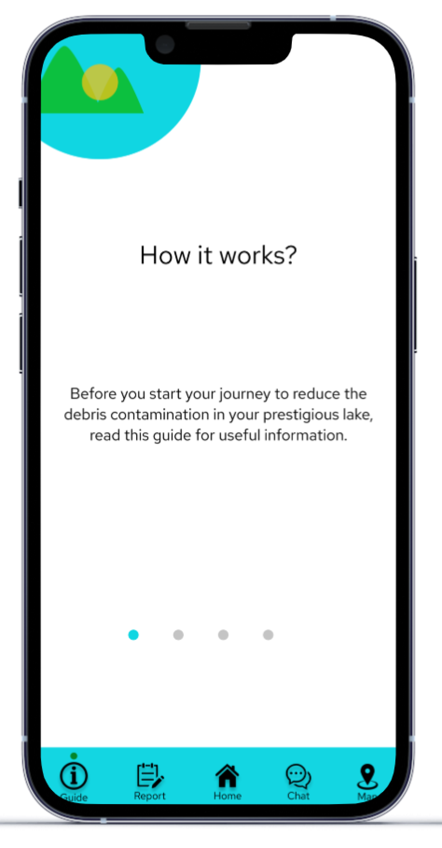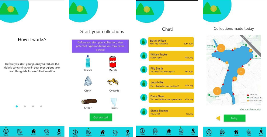 After selecting a suitable theme for PureView, the next step was designing its four main categories, as seen on the right. The first screen displays the "How it Works" page, explaining the app's processes. Secondly showcases the collections screen for users to report their debris collections. Thirdly presents the "Chat" page, allowing users to communicate and report debris as a team. The final screen illustrates the map of Lake Parklands and statistics on debris collections at Forest Lake's Lake Parklands.
