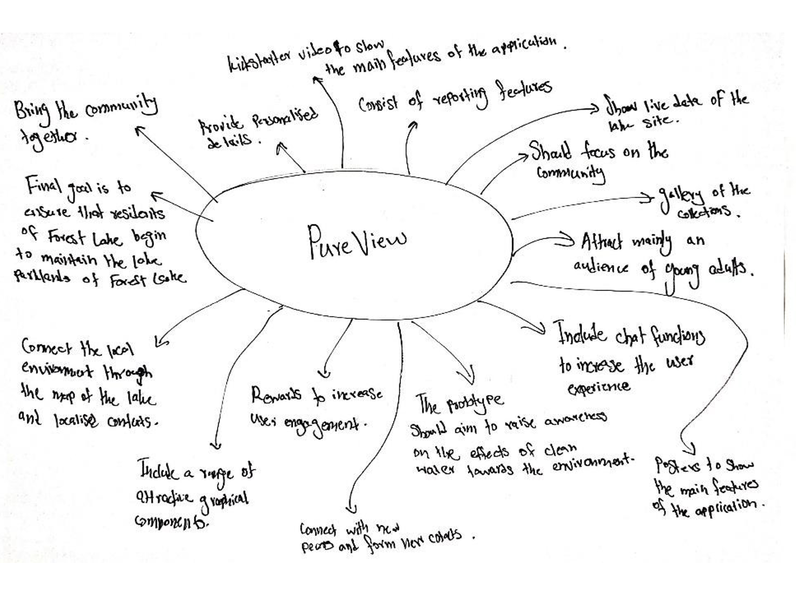 Firstly, following my tour of Forest Lake's Lake Parklands, I conducted a brainstorming session to kickstart the development of PureView for a young adult audience. I initiated a mind map to generate ideas for potential features in the prototype. During my visit to the Lake Parklands of Forest Lake, I noticed a variety of debris scattered across the area, causing adverse effects on the surrounding environment. The mind map below depicts several essential elements that I hope to add in PureView’s interface.