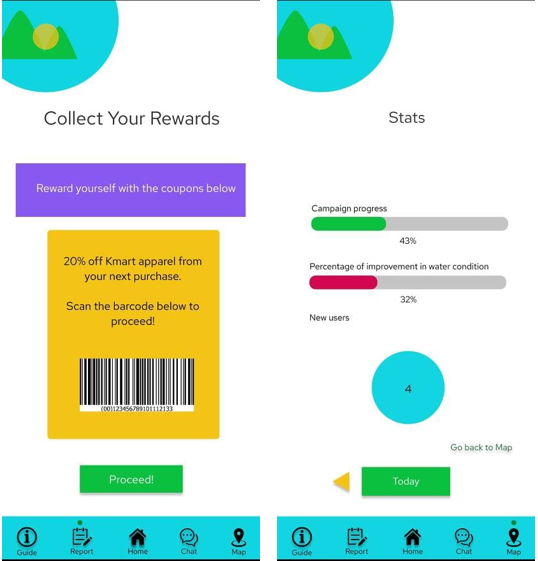 Following the second user testing session, adjustments were implemented, as displayed on the right. As depicted in the “Collect Your Rewards” screen, a barcode was introduced to the rewards page of PureView. This addition serves the purpose of drawing the interest of potential users when the app is used in a specific store. Moreover, the barcode imparts a personalized touch to the interface, indicating authenticity and motivating users to continue collecting debris within Forest Lake's Lake Parklands. “Stats” showcases the statistics screen, allowing users to review their career progress and the percentage of water quality improvement in the lake.