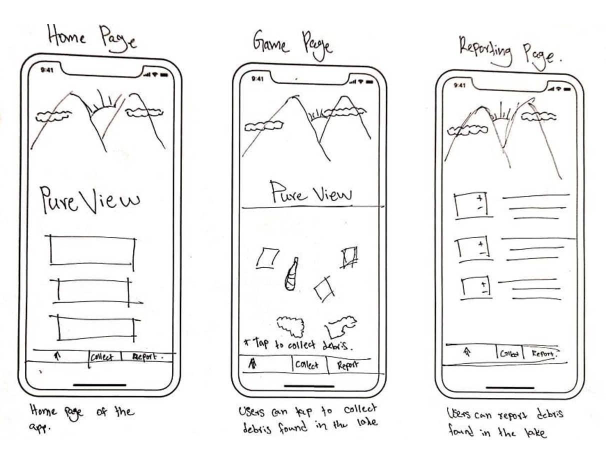 Shown below are initial wireframes illustrating PureView's concepts. These wireframes represent early ideas within the prototype, showcasing a variety of screens to convey PureView's functionality. The prototype's primary focus at this stage is reporting waste in Forest Lake's Lake Parklands, accompanied by a map displaying common debris collection areas. The first concept involves using a camera for debris collection, the second allows reporting through the app, and the third details interactive "click and collect" actions. This phase is pivotal for aligning the prototype with the young adult demographic, with the inclusion of user-friendly navigation buttons to enhance interaction.