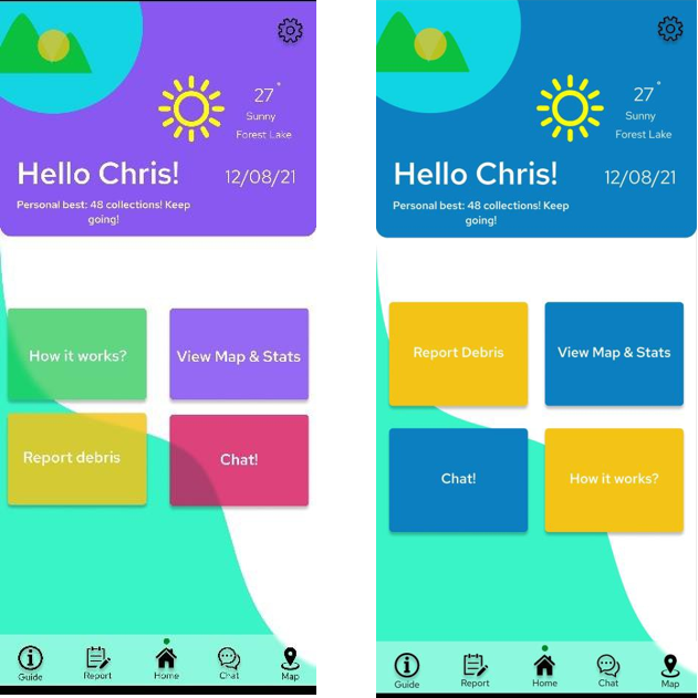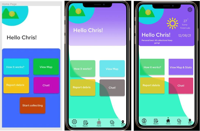 After exploring colour options, I refined PureView's theme. The initial theme, served as a basic color scheme for the high-fidelity prototype layout. The home screen was designed for easy feature access. The image placed on the middle displays a refined layout compared to the previous, with a simple and attractive theme to engage young adults in reporting debris within Forest Lake's Lake Parklands. The third image showcases the final refined color scheme and the four main sections: "How It Works," "View Map and Stats," "Report Debris," and "Chat." For a personalised touch, the prototype includes user progress details and a playful interface to enhance user engagement.