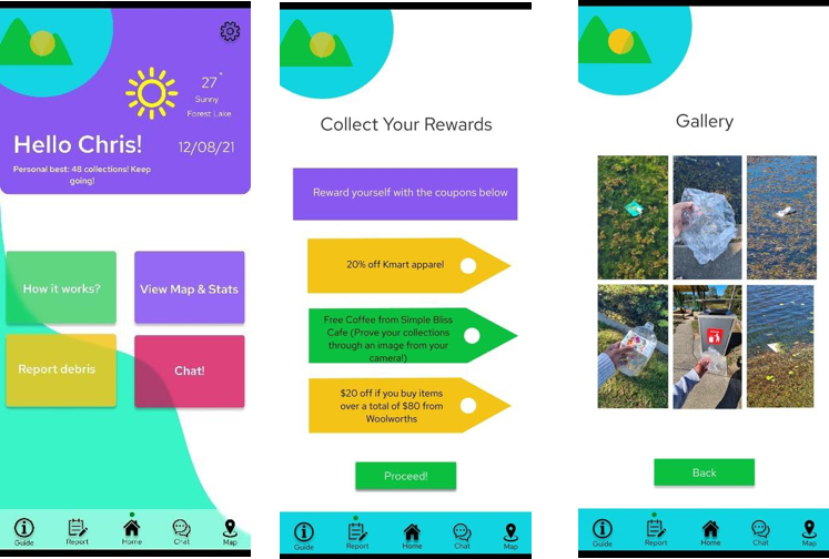 Following the initial user testing session, PureView underwent iterative improvements. As shown on the right, the first screen shows a settings icon was placed on the top-right corner of the home screen, allowing users access to their profiles, the ability to log out, and the option to change their passwords. Secondly, showcases the rewards screen of the prototype, which was integrated based on user feedback received during the initial testing session. The third screen displays the image gallery, featuring pictures taken while collecting debris at Lake Parklands in Forest Lake. This gallery was incorporated to verify collections before users proceed to earn rewards. Furthermore, enhancements were made to the color scheme across the entire prototype to enhance its overall visual appeal.