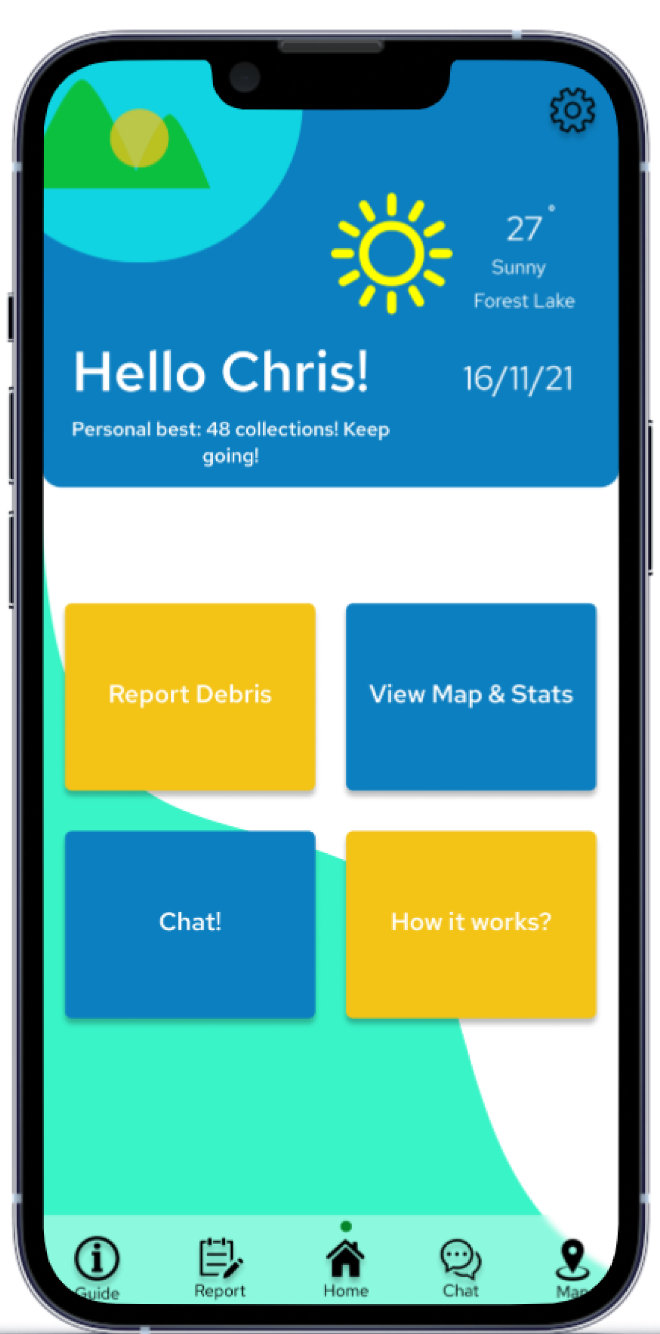 On PureView's home screen, users have access to a variety of options, including reporting debris, viewing maps and statistics, engaging in chats, and exploring the app's functionality. The interface is user-friendly, displaying personal best statistics and supplementary details like weather and date. The primary colours, yellow and blue were thoughtfully selected to align with the Brisbane City Council's identity, ensuring a harmonious connection.