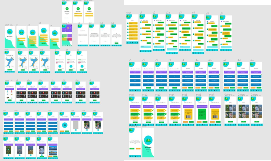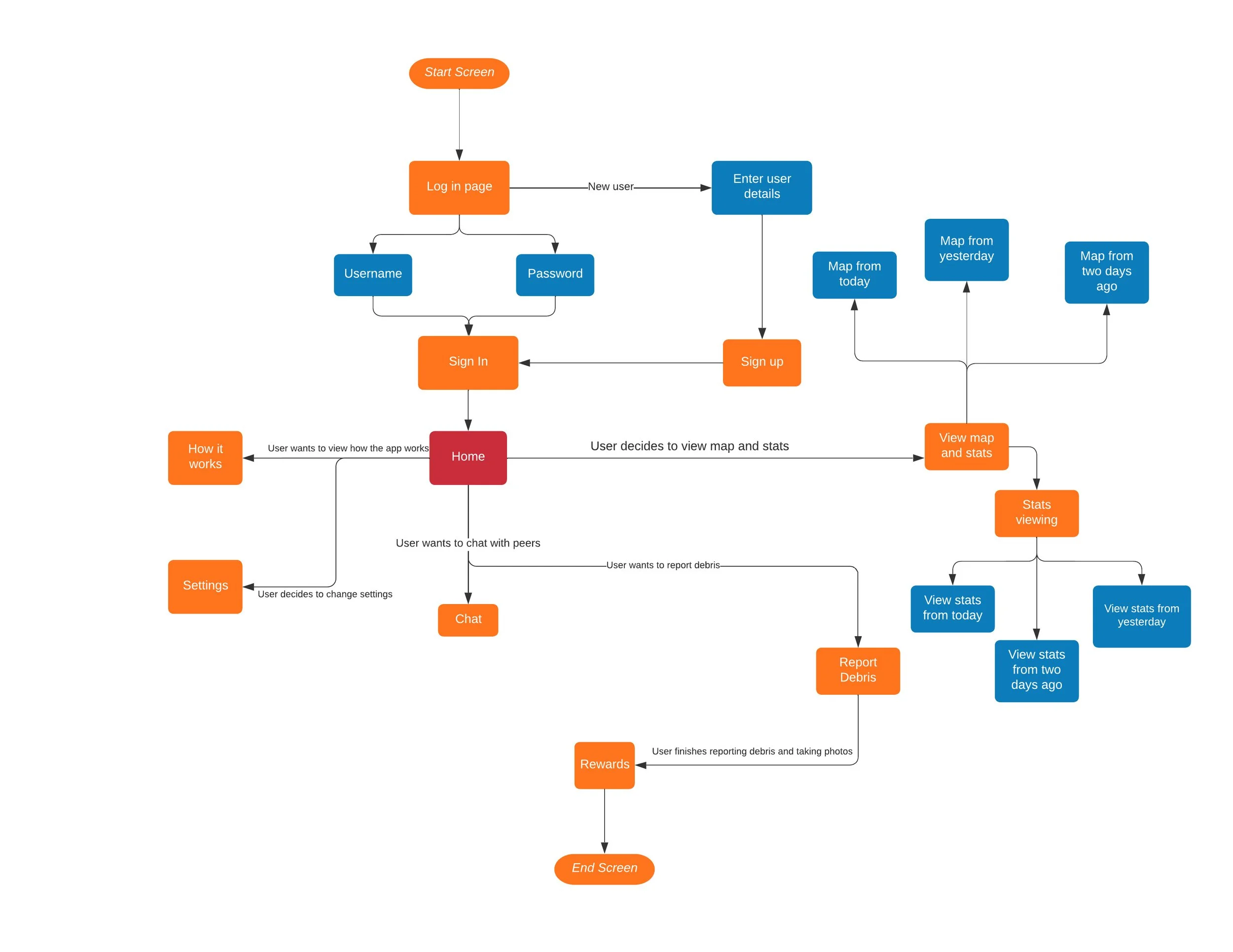 Next in the design process, a flowchart for PureView was introduced to enhance comprehension of the prototype's user flow. The flowchart, shown on the right, outlines the primary sections and their respective subcategories, allowing users to explore the prototype's features in greater detail. Commencing with the start screen, the flowchart leads users to the home screen via login credentials. The home screen branches into four key prototype categories: "How it works," "View Map and Stats," "Report Debris," and "Chat." The flowchart visually presents a range of features within these categories. Mapping PureView's features proved pivotal in ensuring a clear and user-friendly demonstration for the target young adult audience.